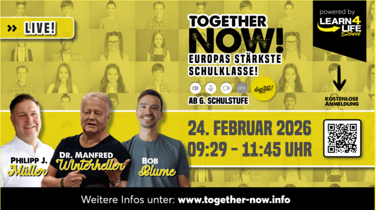 Auch heuer nahmen einige Klassen und LehrerInnen unserer Schule an der Online-Schulstunde zur Persönlichkeitsentwicklung „Europas stärkste Schulklasse“ mit gleich drei spannenden Referenten teil: Bob Blume referierte über das Thema KI und Schule und ging der Frage nach, ob sich Lernen in Zeiten von KI überhaupt noch lohnt. Dr. Manfred Winterheller versuchte in seinem Vortrag Ziele – Vertrauen – Dranbleiben! die SchülerInnen zu motivieren, sich Ziele zu setzen und diese durch Fleiß, Beständigkeit und Vertrauen zu erreichen. Philipp J. Müller motivierte in seinem Vortag Geld gut machen seine ZuhörerInnen dazu, Geld nicht nur auszugeben, zu spenden und zu sparen, sondern auch anzulegen und so für sich und seine finanzielle Zukunft arbeiten zu lassen. Eine geballte Ladung wertvoller Tipps und Ideen, die viel Positives bewirken können! Für alle, die dieses Mal nicht live dabei sein konnten, gibt es wie immer die Möglichkeit, die Vorträge auf www.together-now.info nachzuhören.